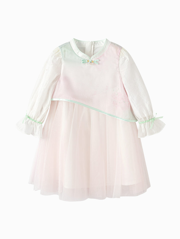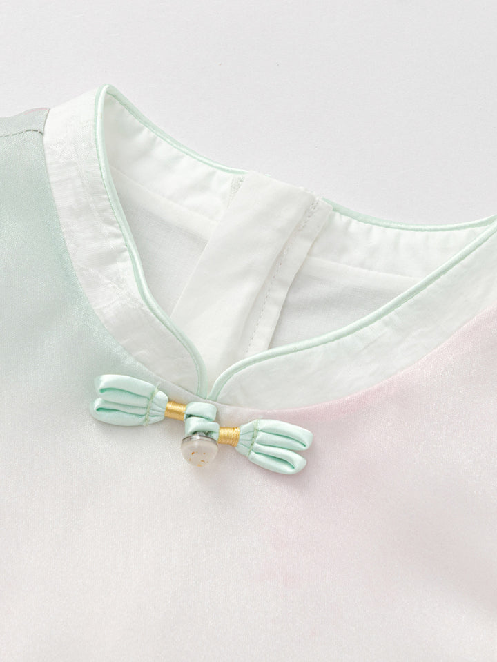 The new Chinese style gradient ink cheongsam has a beveled hem design, paired with soft mesh, and bubble long sleeves with bows at the wrists. It is full of fairy details, and the pure cotton lining absorbs moisture and perspiration, providing a comfortable wearing experience.