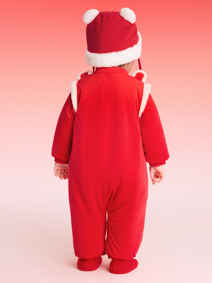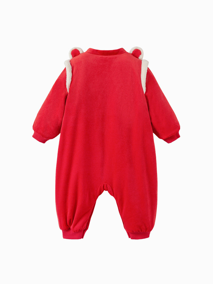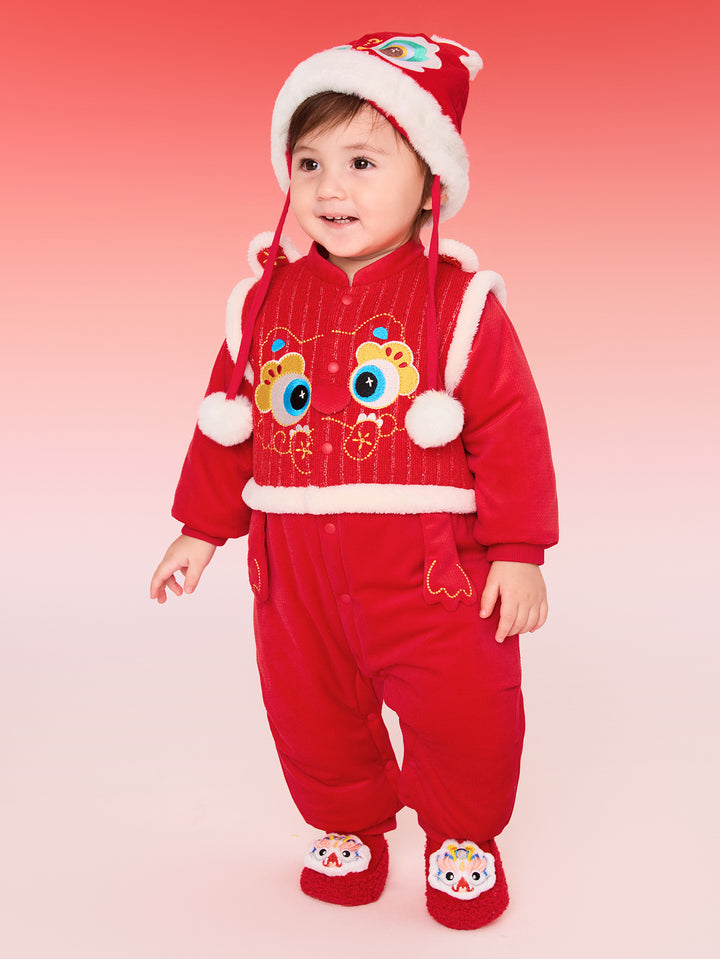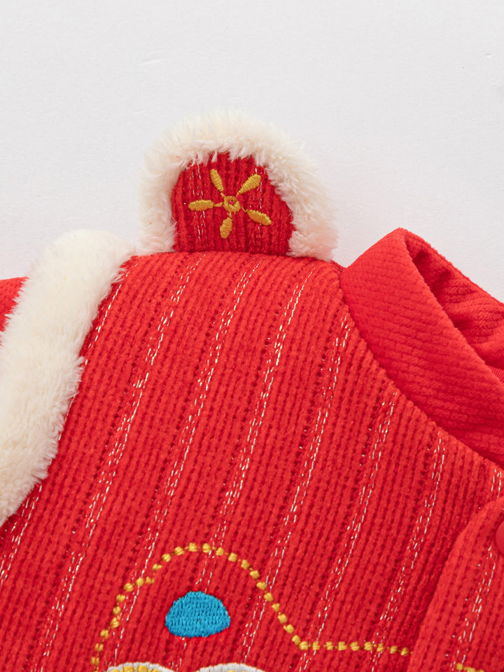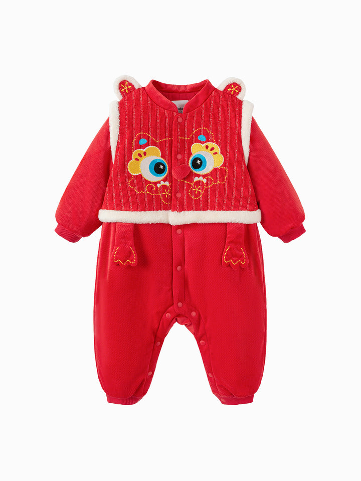 1. Color: Red, the predominant color of the New Year season, complements children's complexions beautifully. 2. Style: Color A features a cute Nian beast embroidered on the chest. The top is crafted from chenille jacquard with a subtle texture, exuding understated luxury and fluffy softness. The lower body is crafted from 200g velvet in a diagonal checkered jacquard, matching the upper body, creating a soft, warm, and comfortable fit. The silhouette is a standard front-opening padded jacket, with a rabbit fur section in the middle creating a faux two-piece design. Color B features a multicolored jacquard pattern on the bandeau top, creating a sweet and adorable bunny design. Brocade is commonly used in high-end clothing, imparting a sense of quality and three-dimensionality, showcasing an elegant and opulent style. Two decorative pendants on the front highlight the New Chinese design. 3. Pairing: Suitable for layering with a full-print or red T-shirt. 4. Season: Suitable for late winter and early spring as a New Chinese New Year outfit.
