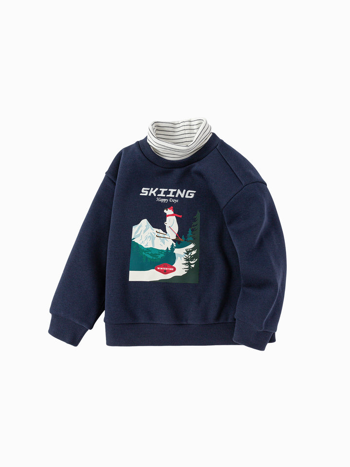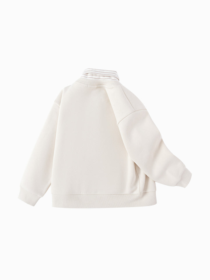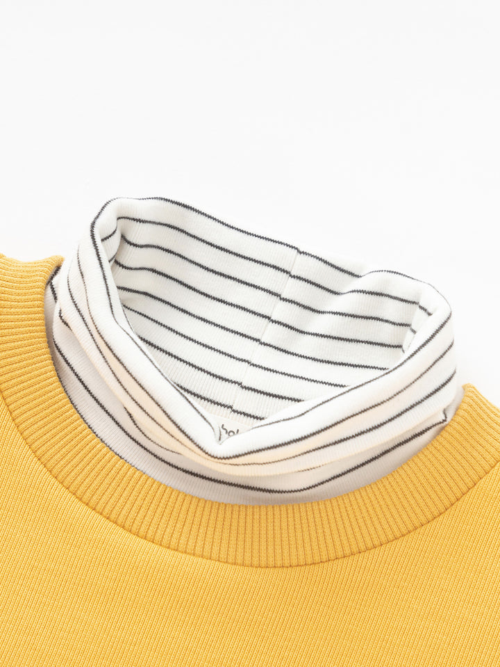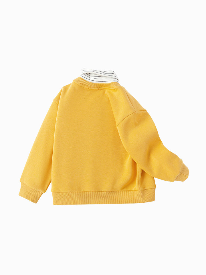 1> Dit tweedelige nep-sweatshirt met kraag is verkrijgbaar in crème, marineblauw en abrikoosgeel, waardoor kleine jongens er energiek en stijlvol uitzien.