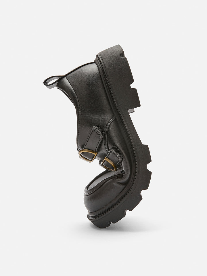 1. Cholewka ma kształt wyprofilowany w kostce, co zapewnia wygodę i ciepło. 2. Wyściółka z tkaniny zapewnia dodatkowy komfort, a zakrzywiona cholewka buta zapobiega otarciom kości kostki. 3. Pasek na podbiciu umożliwia łatwe zakładanie i zdejmowanie. 4. Gumowa podeszwa jest odporna na zużycie i zapewnia lepszą amortyzację dzięki elastycznej konstrukcji w przedniej części stopy.