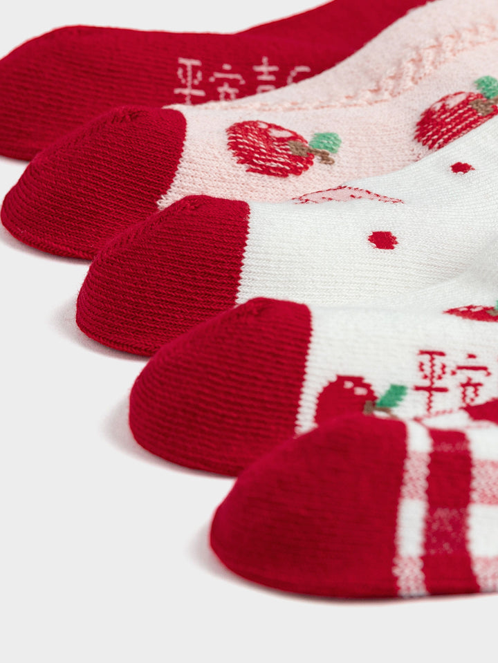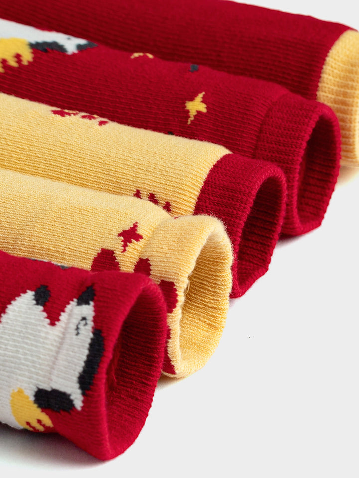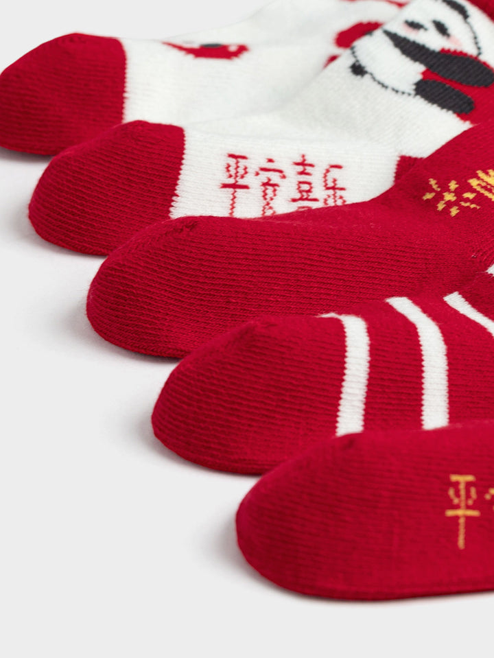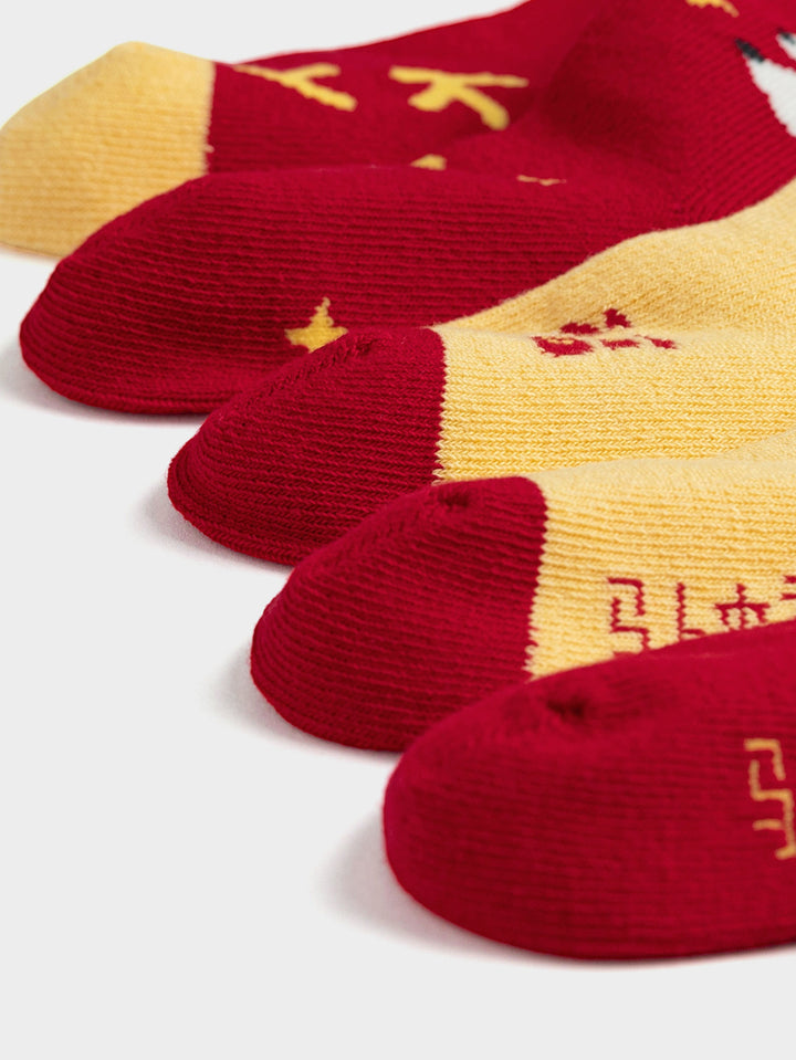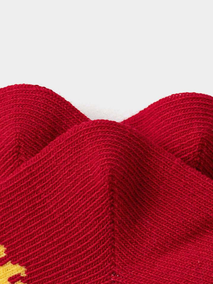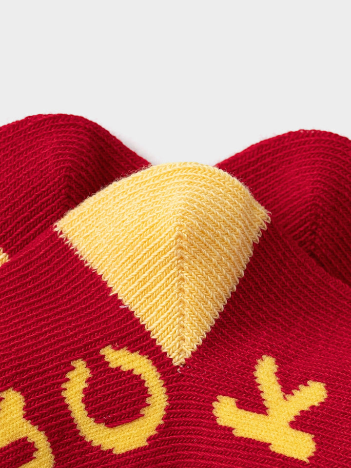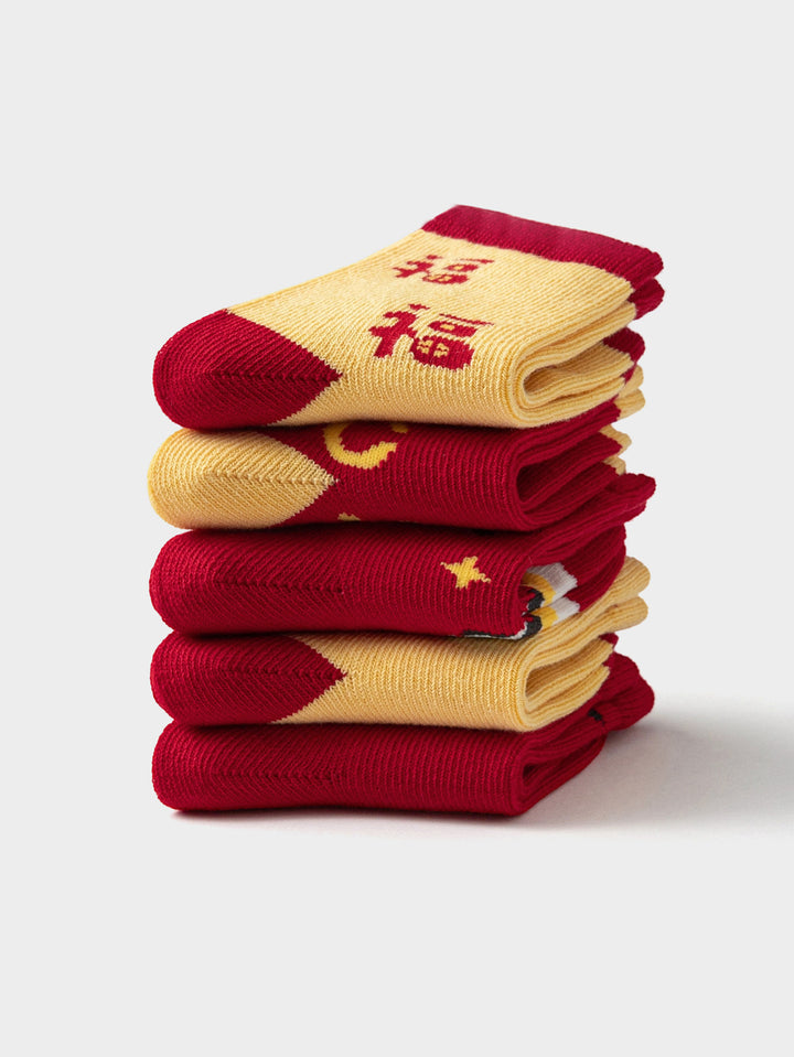 Main Selling Point: New Year's Lucky Socks. A New Year's "Lucky" Socks plan brings you good luck and blessings. Wear red socks to bring you great fortune in the New Year. Secondary Selling Points: 1. Material: Selected high-grade combed cotton from Bala, using compact spinning technology. Compared to ordinary combed cotton, this yarn has less hairiness, higher strength, a smoother surface, and excellent pilling resistance and abrasion resistance. The double-ply yarn is suitable for winter wear and is comfortable and skin-friendly. 1. Made of textile with a golden ratio of Lycra and spandex, it has high resilience, is more comfortable to wear, is not easy to deform, and has super elastic screw mouth that does not squeeze the feet. 2. Craftsmanship: Boneless hand-sewn toe, no bulge when worn, easy to grow and develop; uses trapezoidal plate shaping technology, the socks fit the leg shape, not easy to squeeze the legs; 3D three-dimensional heel, socks do not fall off 3. Version: The design is above the ankle to meet a variety of wearing needs 4. Design: Use warm red as the main color, and for auxiliary colors, use colors with strong brightness and contrast to give people a warm, lively and joyful feeling; the overall use of bright color contrast highlights the red New Year attributes and romantic traditional culture of the product. The pattern uses auspicious graphics with the meaning of "full of blessings" to express good wishes; New Year's "red" luck plan. Auspicious blessings, good luck in the new year, more auspicious