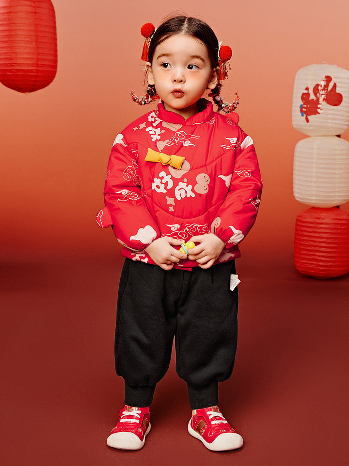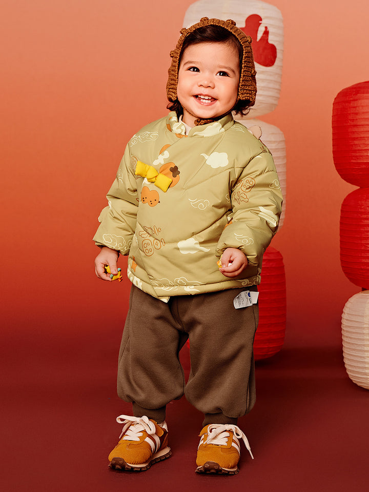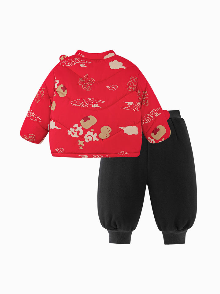Top: Outer fabric: 100% polyester Lining: 100% polyester Filling: 100% polyester Pants: Outer fabric: 63.8% polyester 36.2% cotton