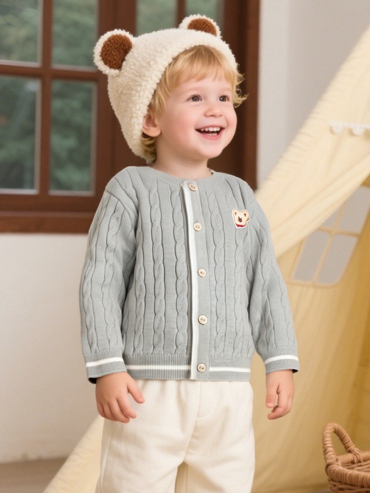 1. Color: This sweater has four colors, classic white and gray tones are versatile and easy to wear. The classic stripes are also fashionable and handsome. 2. Style: This is a standard version with contrasting stripes on the pattern and a hollow design of the front texture. The design is rich in details and the fabric feels soft, making it particularly comfortable for children to wear. 3. Matching: This sweater can be matched with T-shirts and pants for children to wear daily or go out. 4. Season: This thickness is suitable for wearing in autumn.