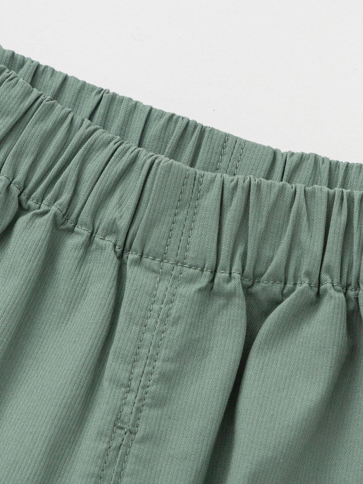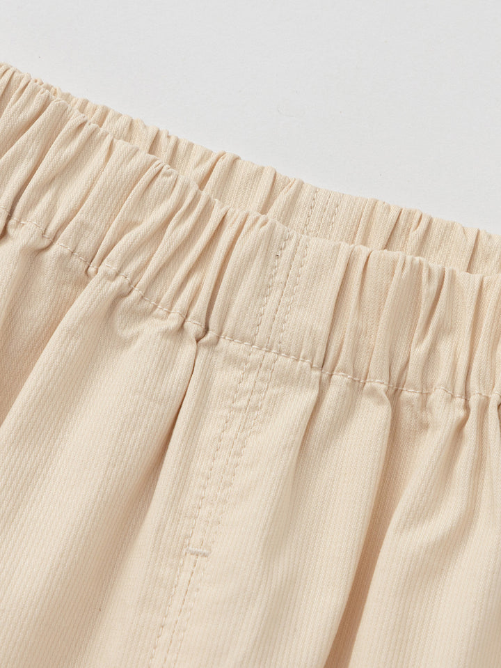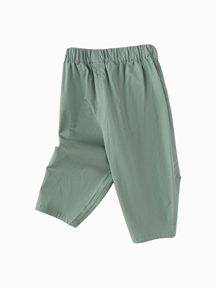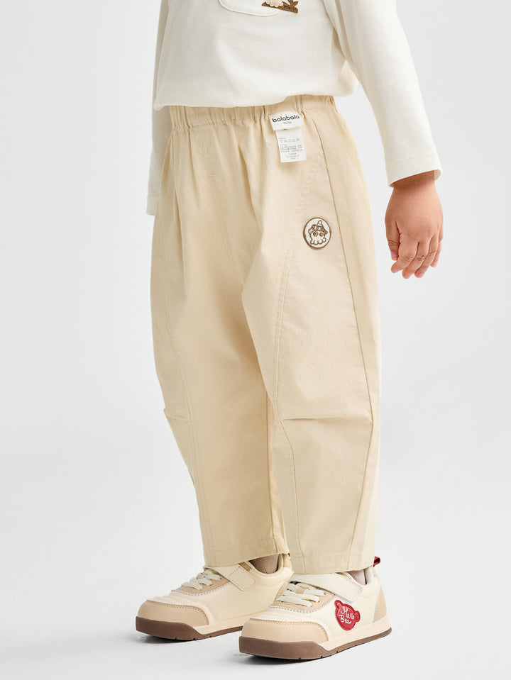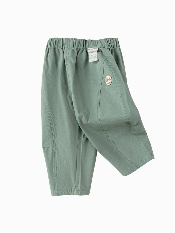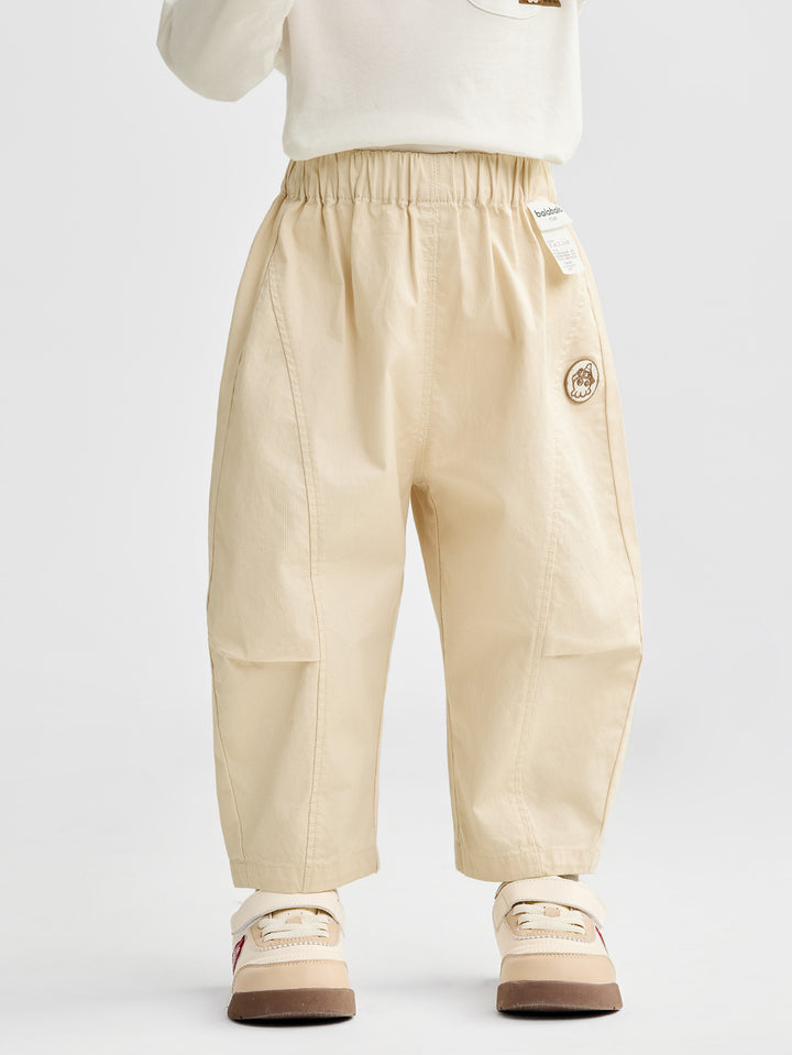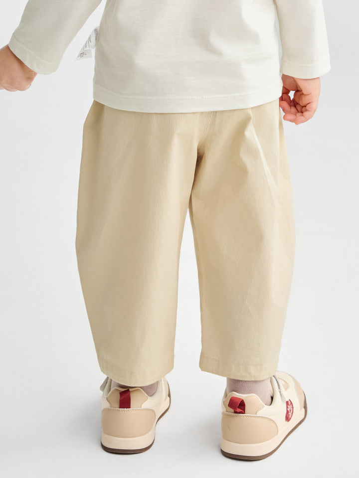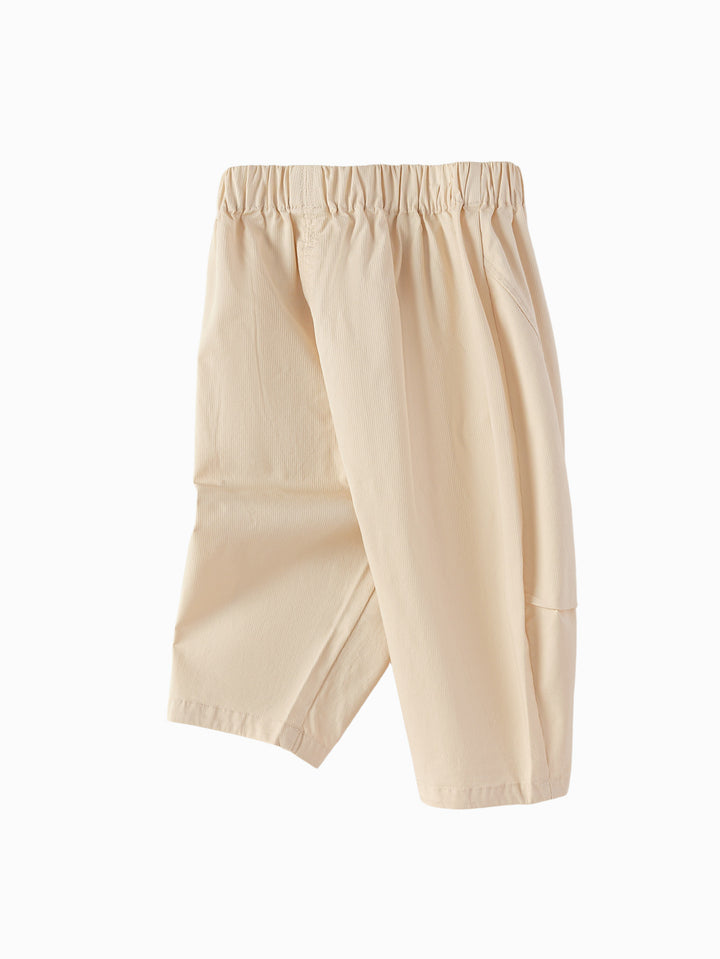 Fabric: Made of 100% cotton with a subtle, light texture for a soft and sleek feel. Fit: Designed with a slim, banana-like fit and slightly tapered cuffs, these pants are stylish and comfortable. Curved, three-dimensional, split, and pressurized pleats at the knees ensure greater mobility and freedom for everyday activities, whether running, jumping, or playing. Details: The pants are embellished with a delicate, gold-embroidered "Xia Ba" logo, showcasing premium quality and unique style. From daily activities at kindergarten to highlight moments like family gatherings and holiday celebrations, these pants will ensure your baby boy looks his best and becomes the center of attention.