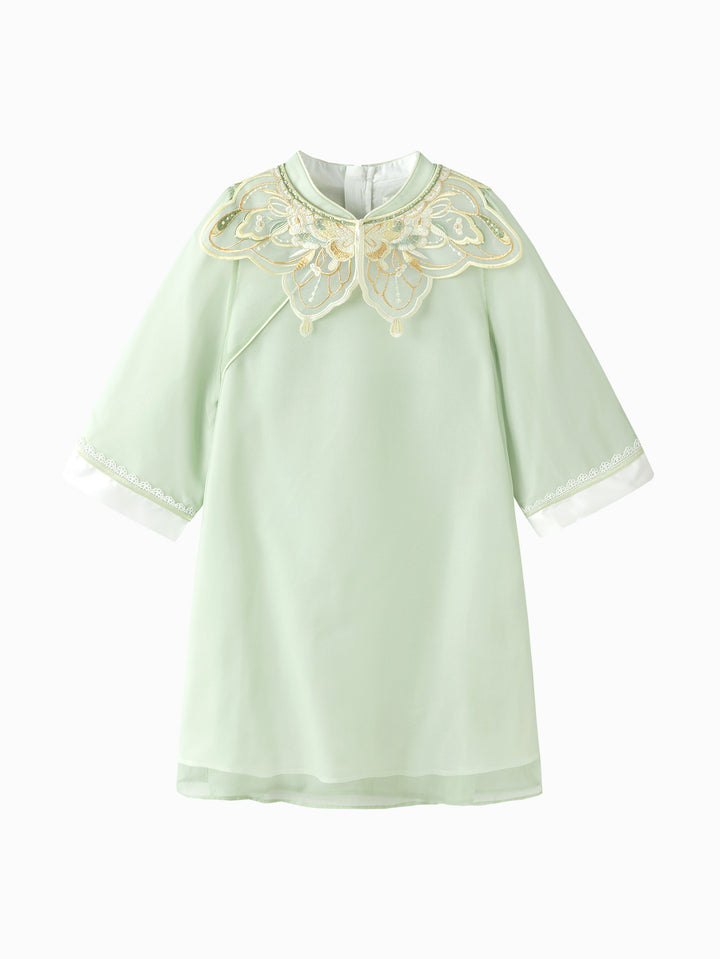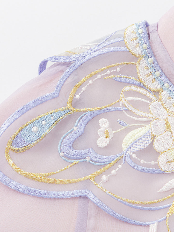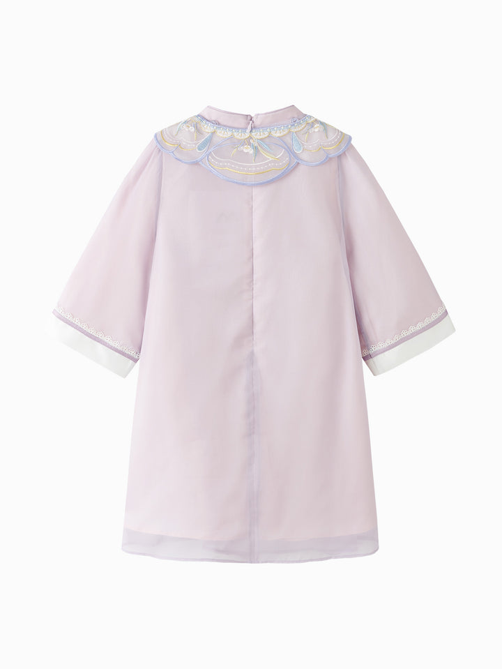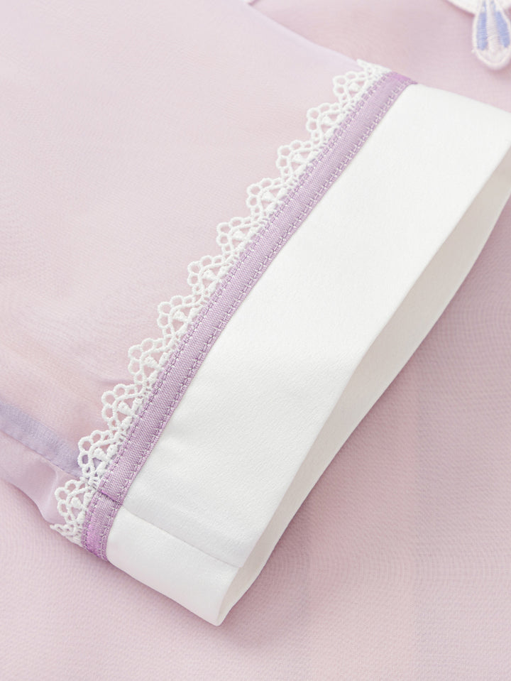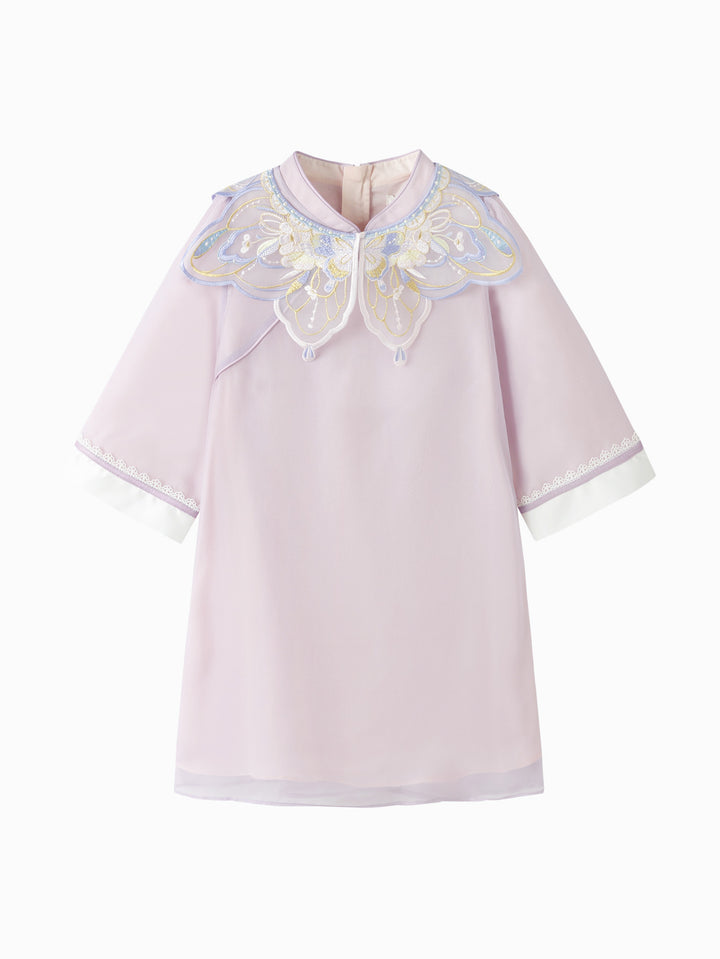 1. Available in two colors: pink and purple, sweet and romantic, and yellow-green, eye-catching and bright. 2. A-line silhouette, easy to move around, suitable for girls of all shapes and sizes. 3. The collar features a detachable, delicately embroidered shoulder. The butterfly-shaped design adds a sweet touch. 4. Made of soft chiffon, it's lightweight and soft, making it very comfortable to wear.