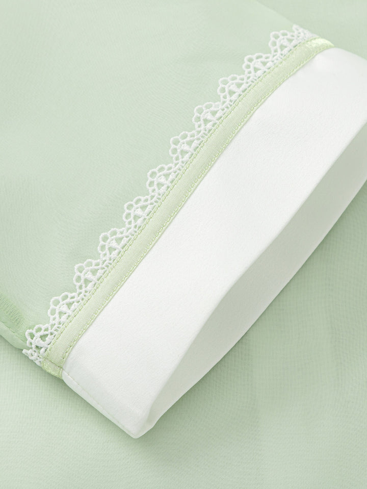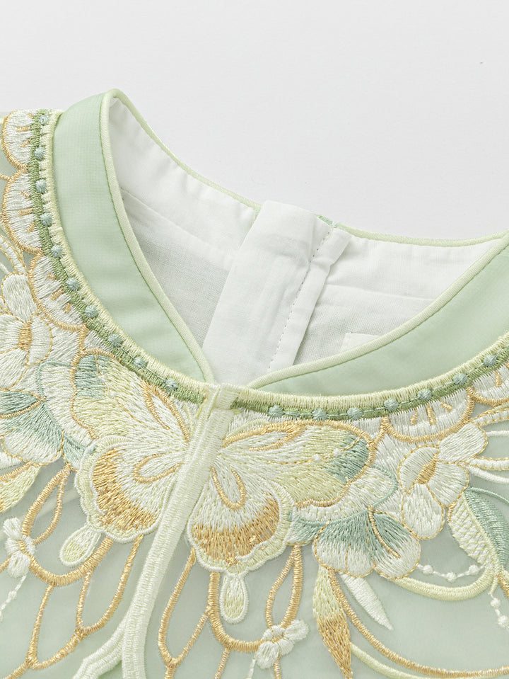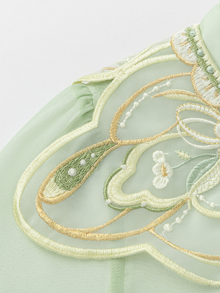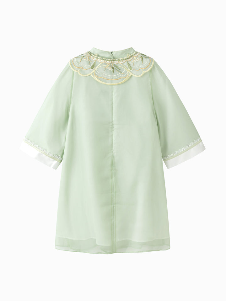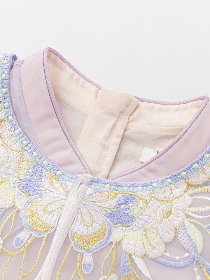1. Available in two colors: pink and purple, sweet and romantic, and yellow-green, eye-catching and bright. 2. A-line silhouette, easy to move around, suitable for girls of all shapes and sizes. 3. The collar features a detachable, delicately embroidered shoulder. The butterfly-shaped design adds a sweet touch. 4. Made of soft chiffon, it's lightweight and soft, making it very comfortable to wear.