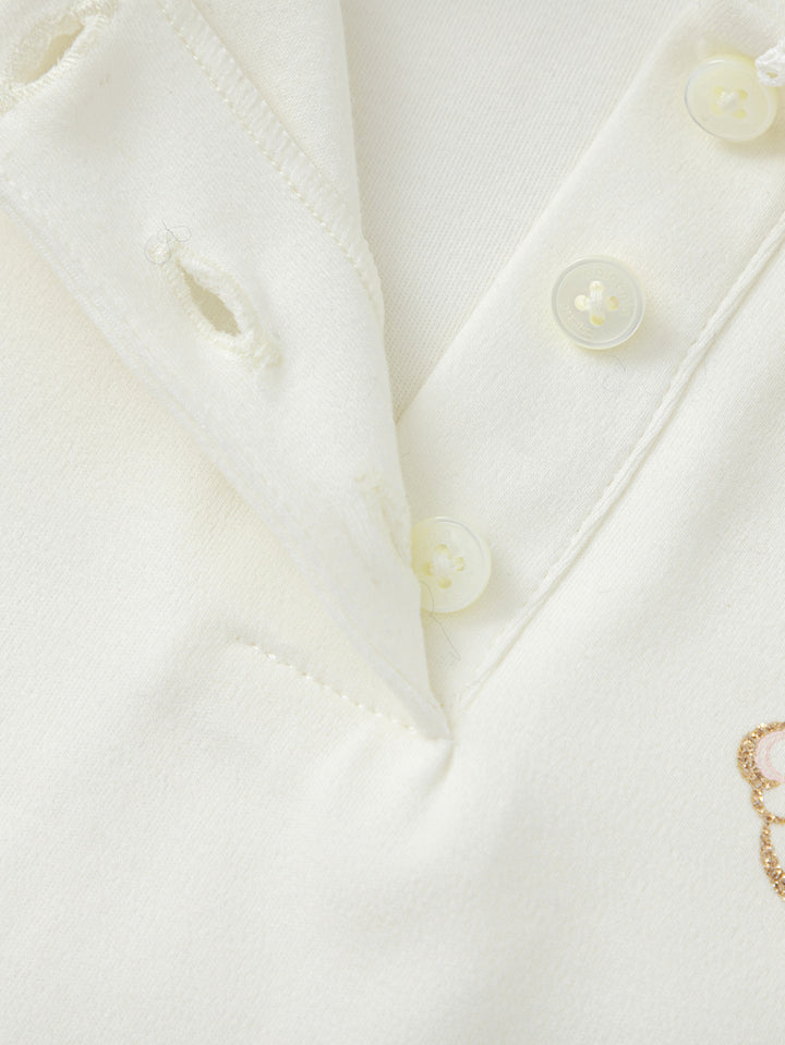2、Baby collar style, loose fit; collar decorated with lace applique, exquisite craftsmanship; placket integrated design; natural shell buttons, highly refined