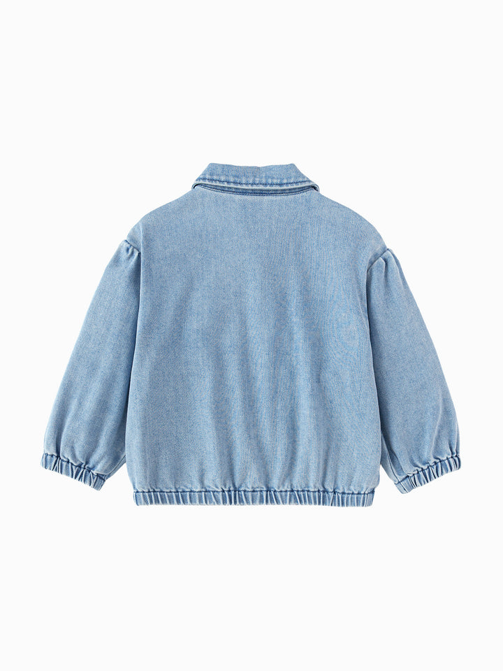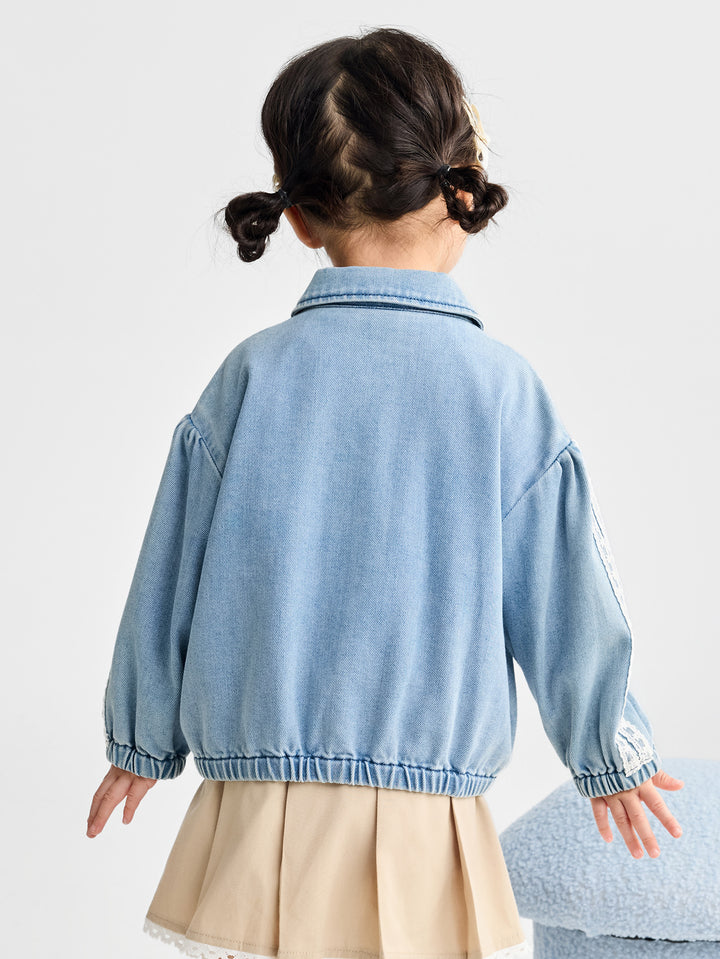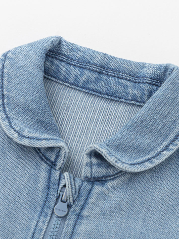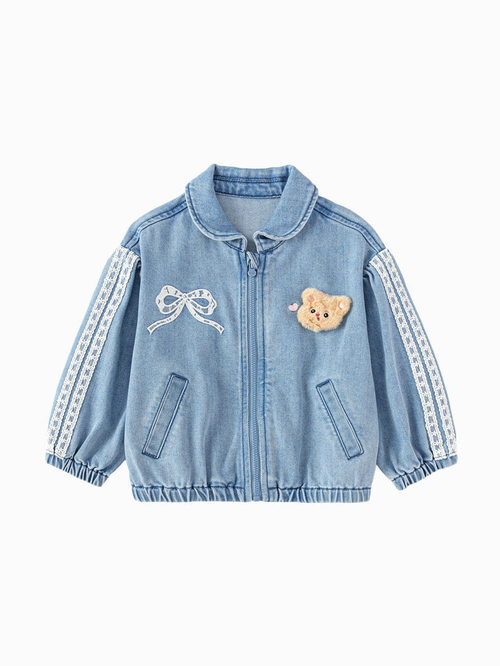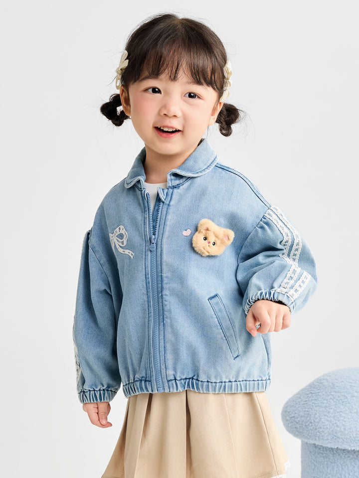 1. Color: This denim dress is a refreshing denim blue, and the baby is lively and cute when wearing it. 2. Style: This denim jacket adopts a classic version design, which is comfortable and not tight. The baby is lively and cute when wearing it. The zipper design on the chest is convenient for parents to put on and take off, and the lace details add a sweet touch. The three-dimensional bear badge on the chest is cute and adorable. Matching: This jacket is very suitable for wearing when going out to play or going out. 4. Season: This thickness is suitable for wearing in autumn.