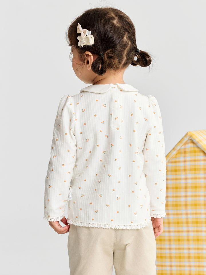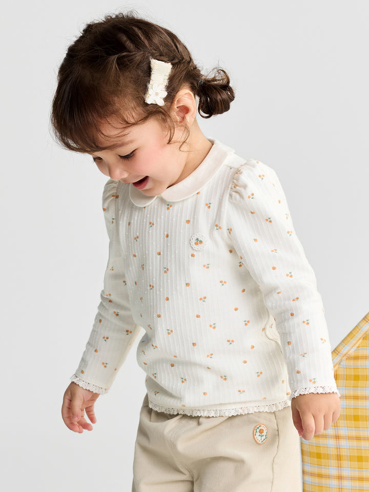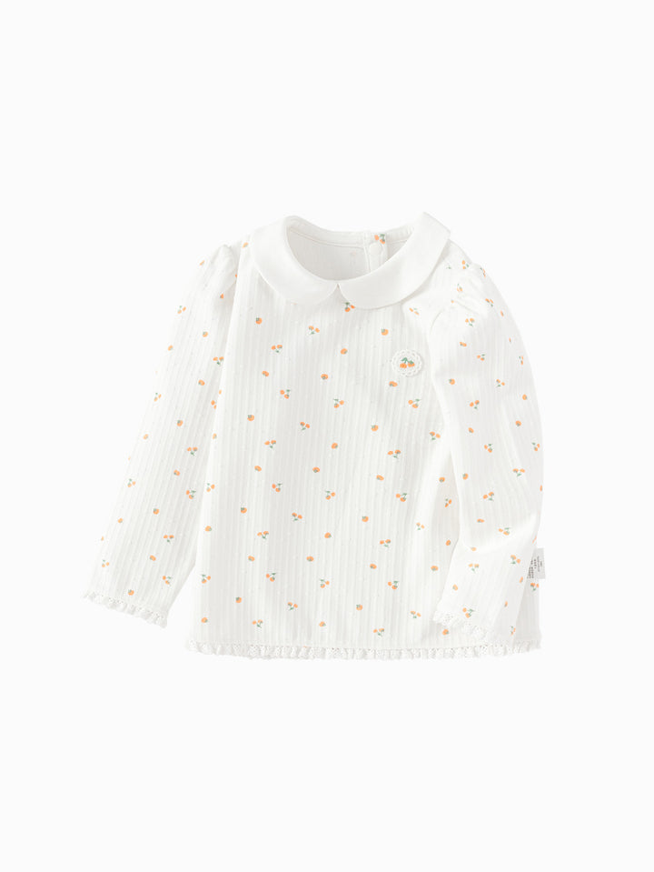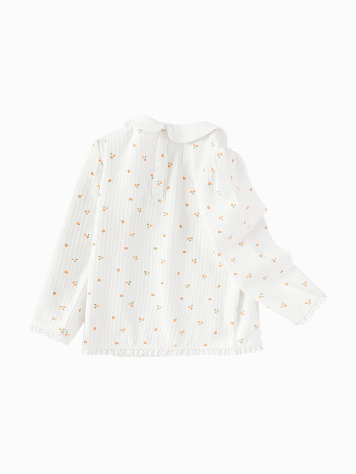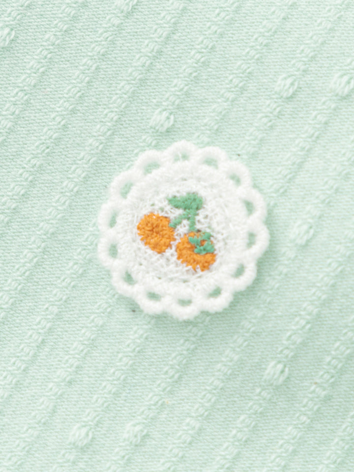 1. Crafted from 220g transfer jacquard pattern, the fabric is stylish and soft to the touch. 2. The small lapel and lantern sleeves, along with the embroidered patch on the chest and lace trim at the hem, create a sweet and adorable look. The all-over persimmon pattern adds a touch of flair.