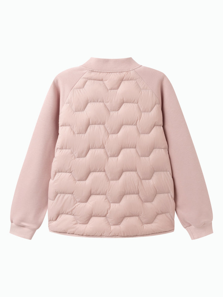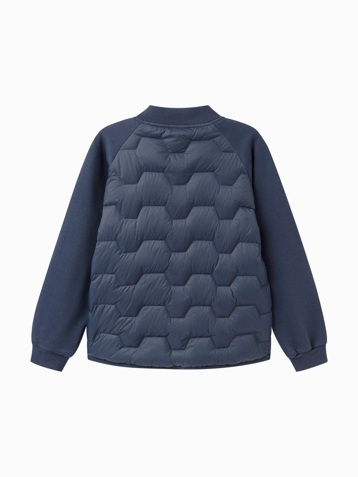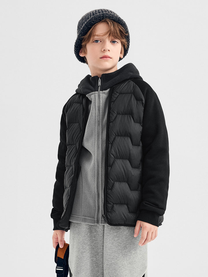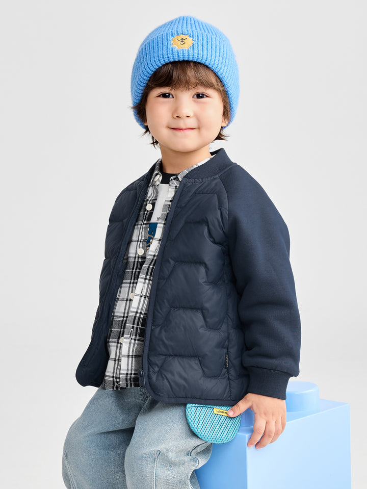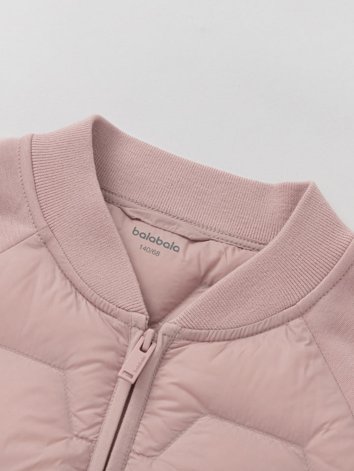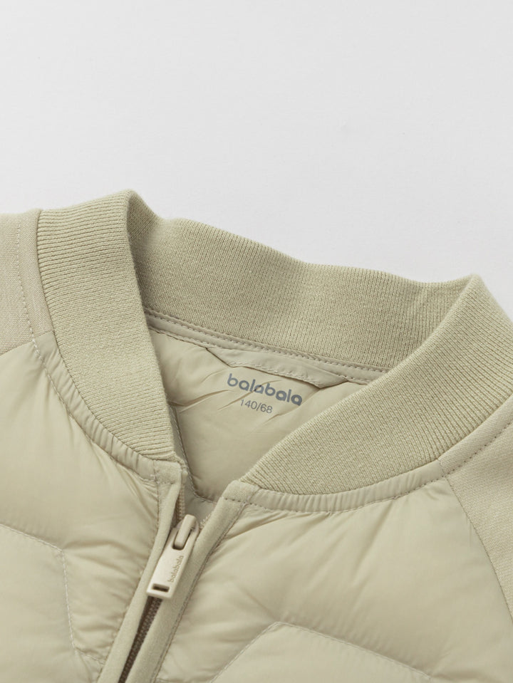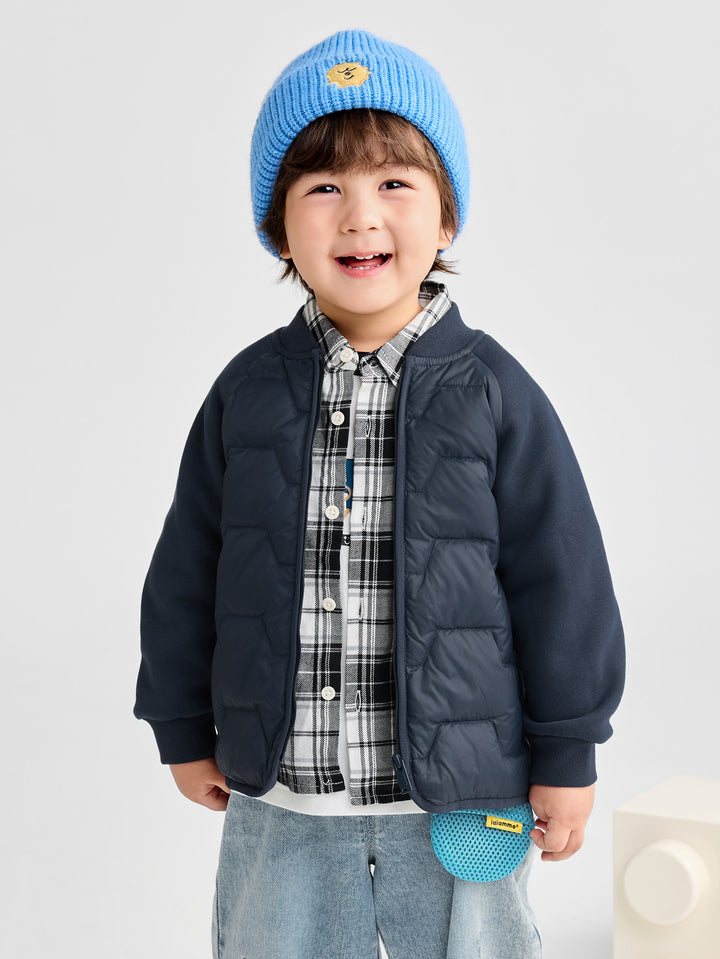 Sleeves made of brushed knit fabric, body with light down; high fill 70g/m², 90 duck down, zoned warmth, school uniform style.