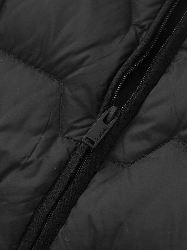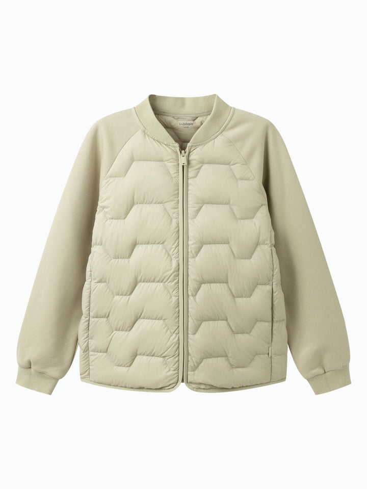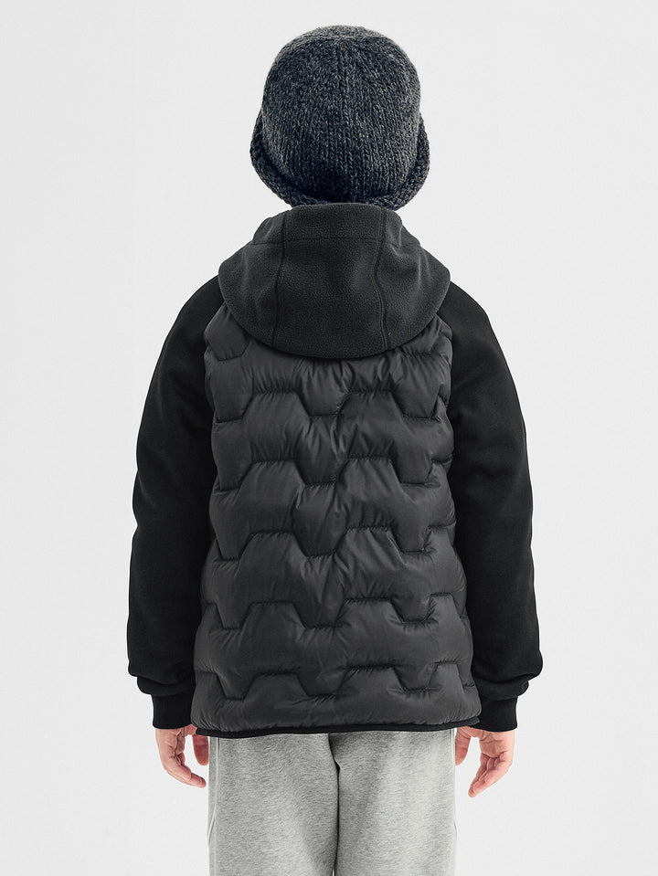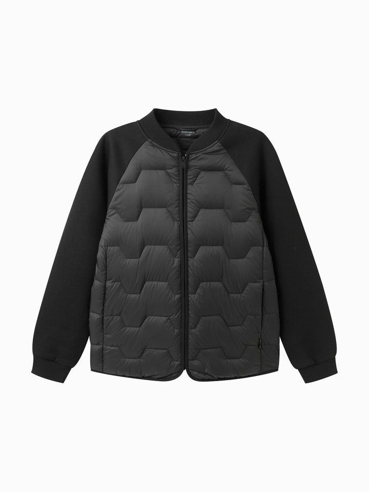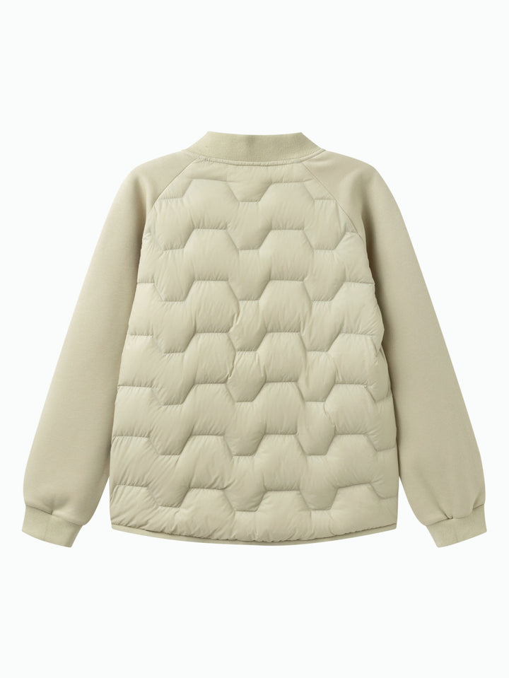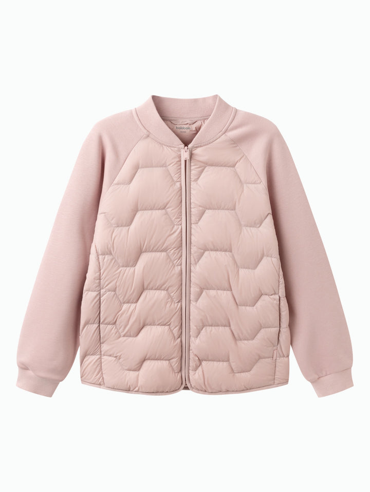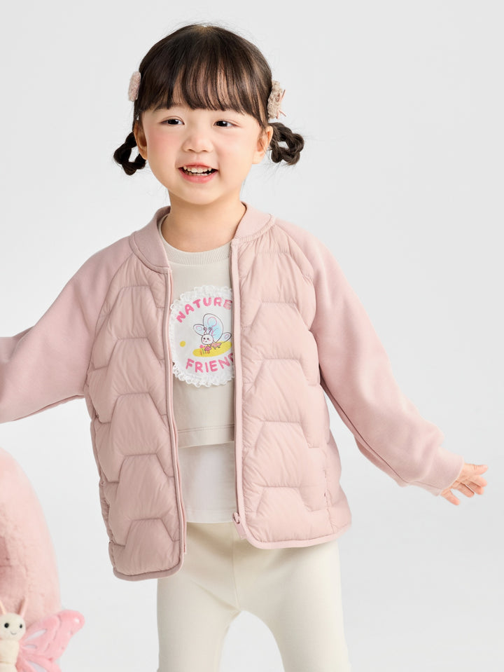 Sleeves made of brushed knit fabric, body with light down; high fill 70g/m², 90 duck down, zoned warmth, school uniform style.