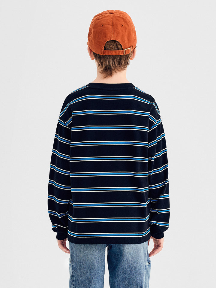 1. A colorful striped T-shirt with varying spacing, novel stripe accents, and heavyweight, textured fabric. 2. A patch pocket on the left chest adds a touch of design and convenient storage for small items. The monogram print and square emoji patch add a layered feel to the striped T-shirt. 3. A loose-fitting outerwear T-shirt with ribbed cuffs, perfect for wearing alone or as an inner layer.