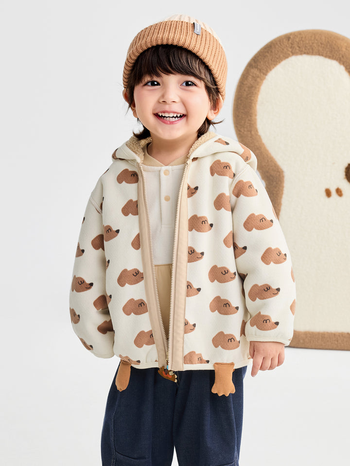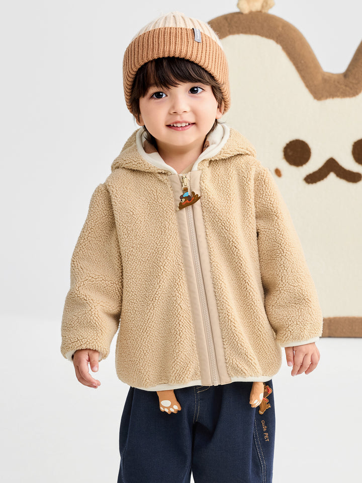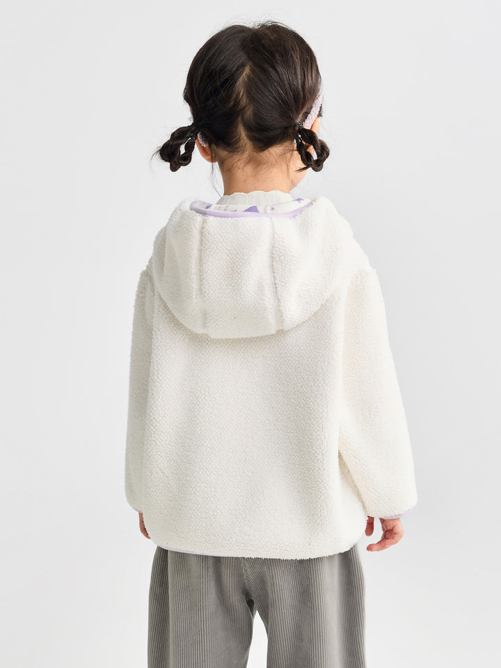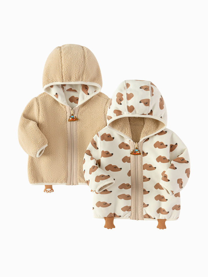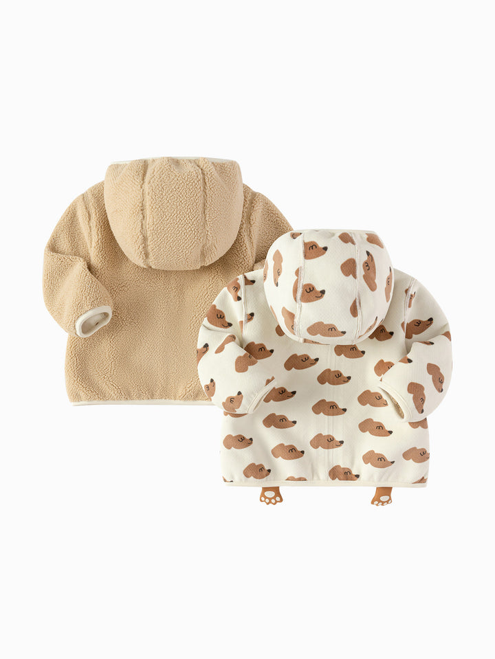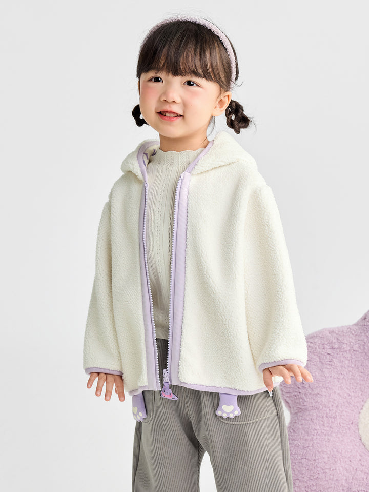 This model uses a lambswool composite fabric, with plush on one side and printed fabric on the other side to meet various wearing needs. It has a loose version, a hooded design, a placket spliced with woven fabric, and a pull-head decorated with a three-dimensional cotton-padded woven label, which is fun and cute. The hem is decorated with three-dimensional cotton-padded feet. The whole piece is full of cute details.