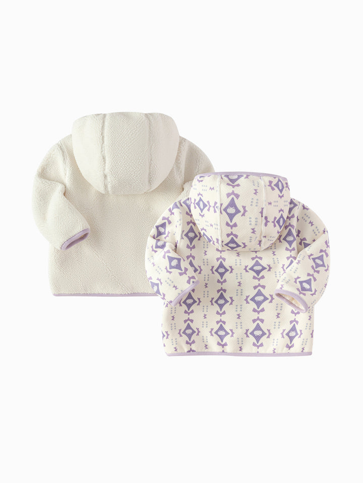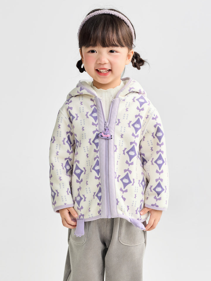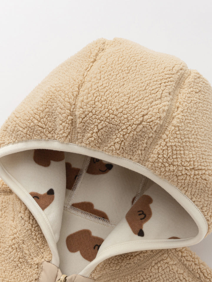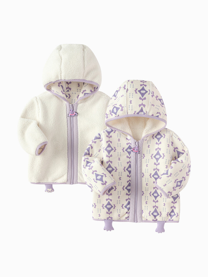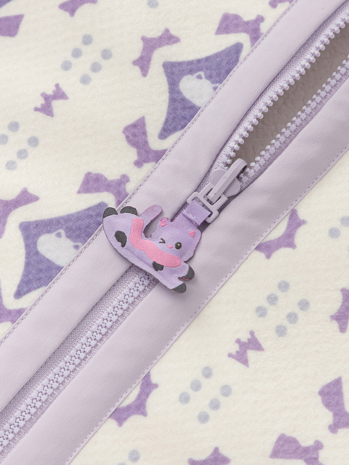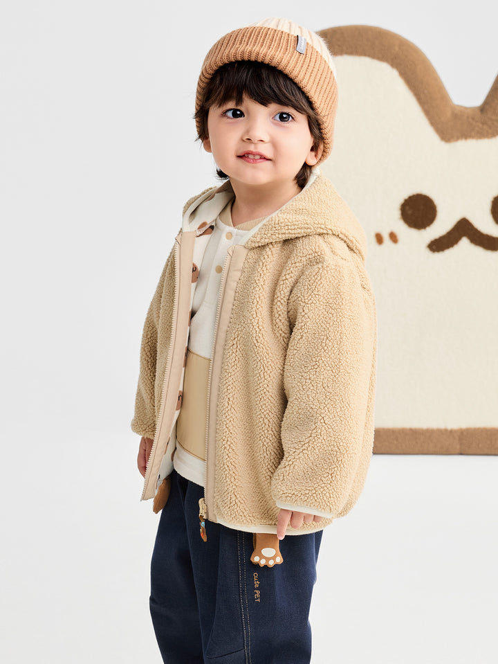 This model uses a lambswool composite fabric, with plush on one side and printed fabric on the other side to meet various wearing needs. It has a loose version, a hooded design, a placket spliced with woven fabric, and a pull-head decorated with a three-dimensional cotton-padded woven label, which is fun and cute. The hem is decorated with three-dimensional cotton-padded feet. The whole piece is full of cute details.