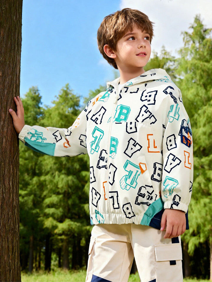 Matte peach skin fabric effect, film-coated waterproof and breathable fabric, recycleable environmentally friendly fabric, skin-friendly and comfortable 145G/TC knitted single-sided lining; college style letter floral pattern and versatile brown color matching; hooded style, raglan sleeves, short front and long back design, elastic hem; college style letter rubber patch on the left sleeve.