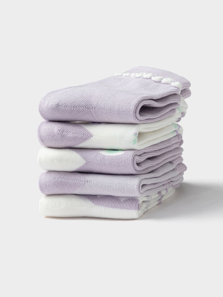 Main selling point: The 5-pair combination of sweet jacquard socks is sweet and artistic, enhancing a girl's temperament. The cute girlish jacquard, small animal patterns and sweet elements are combined to highlight the sweetness and cuteness. Easy to match and suitable for all seasons. Double thickness. Secondary selling points: 1. Material: Selected high-end combed cotton from Bala, using compact siro spinning technology. Compared with ordinary combed cotton, this type of yarn has less hairiness, higher strength, and a smoother yarn surface. It has excellent anti-pilling and wear resistance. It is woven in a golden ratio with stretch spandex, with high resilience, more comfortable to wear, and not easy to deform; double thickness, suitable for all seasons. 2. Craftsmanship: No bone seam, no bulge when worn, easy to grow and develop; using trapezoidal plate shaping technology, the socks fit the leg shape and are not easy to squeeze the legs; 3D three-dimensional heel, socks will not fall off. 3. Version: The sock height design is above the ankle to meet a variety of wearing needs. 4. Design: Exquisite edge trimming of the sock cuff, sweet jacquard, a must-have for fashionable girls; 5-pair combination with super cost-effectiveness.